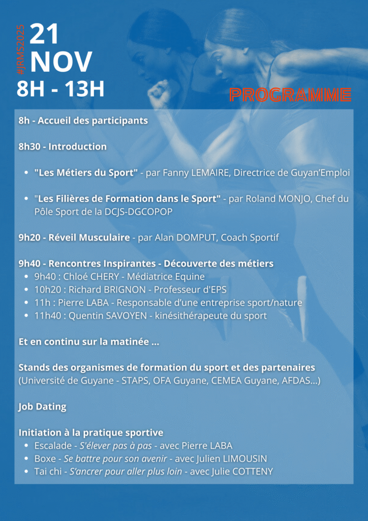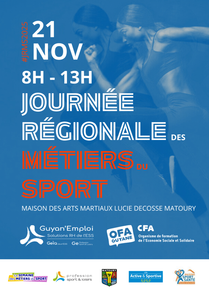 Le 21 novembre 2025, la Maison des Arts Martiaux Lucie Décosse à Matoury a accueilli la Journée Régionale des Métiers du Sport (JRMS), un événement phare visant à faire découvrir les métiers et les formations du secteur sportif en Guyane. Organisée par Guyan’Emploi et OFA Guyane, cet évènement a permis la rencontre entre le public (les lycéens, étudiants, demandeurs d’emploi) et les professionnels du sport.